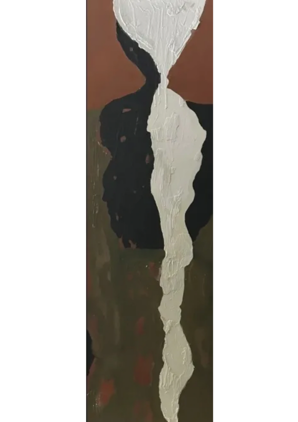 Texture you can almost feel horizontal acrylic painting capturing the quiet elegance of a woman seen from behind, her posture both strong and serene. Her long white ponytail cascades down her back, sculpted with layered acrylic and gypsum to create rich, tactile texture that rises from the canvas