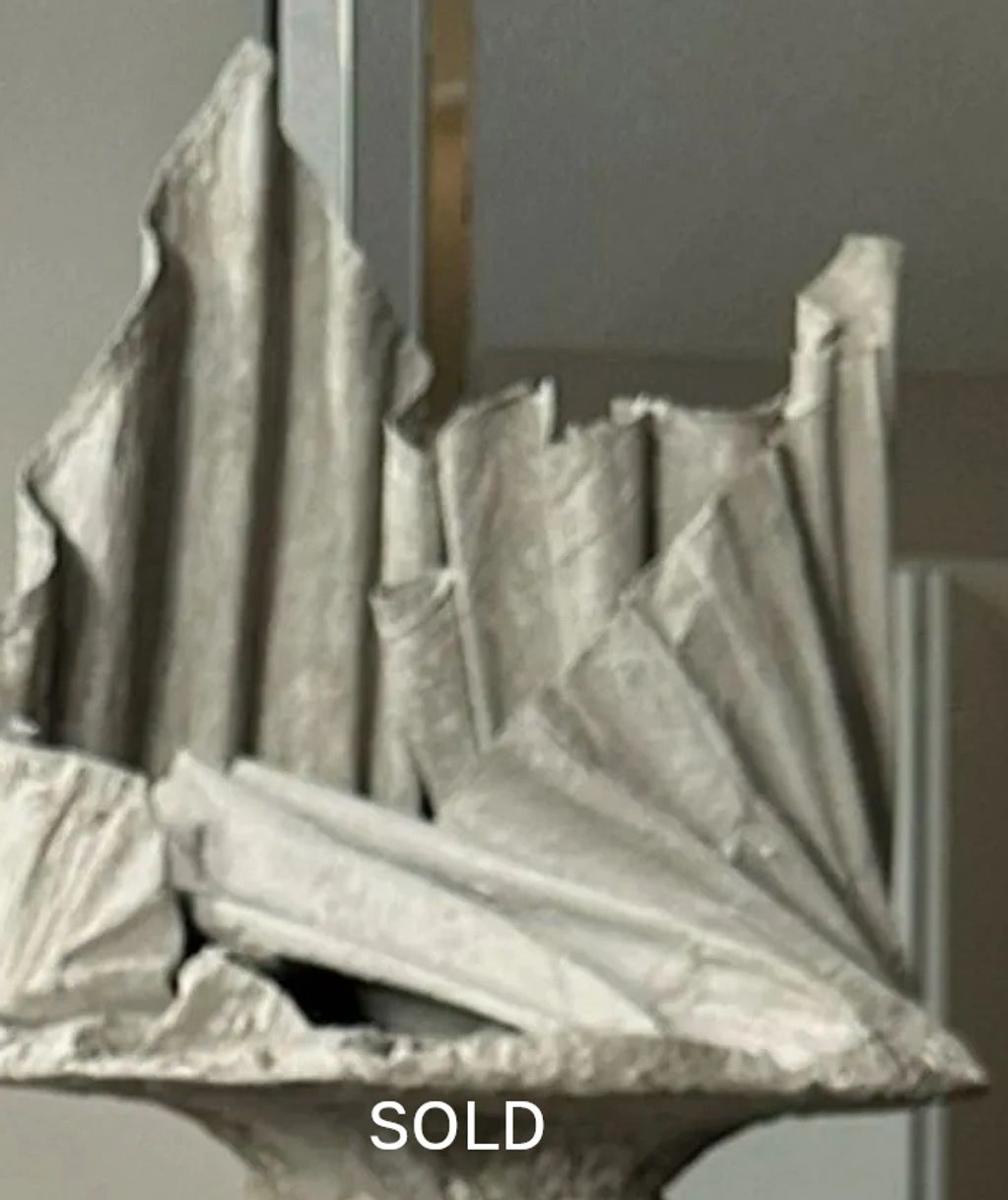 This towering cement sculptured vase stands like a monument to strength and refinement , architectural in spirit, yet artistic in execution. Hand-shaped with an impeccable folding technique, its surface mimics the disciplined lines of a rising structure, where precision meets power. Each angular crease is intentionally formed, creating depth, shadow, and movement