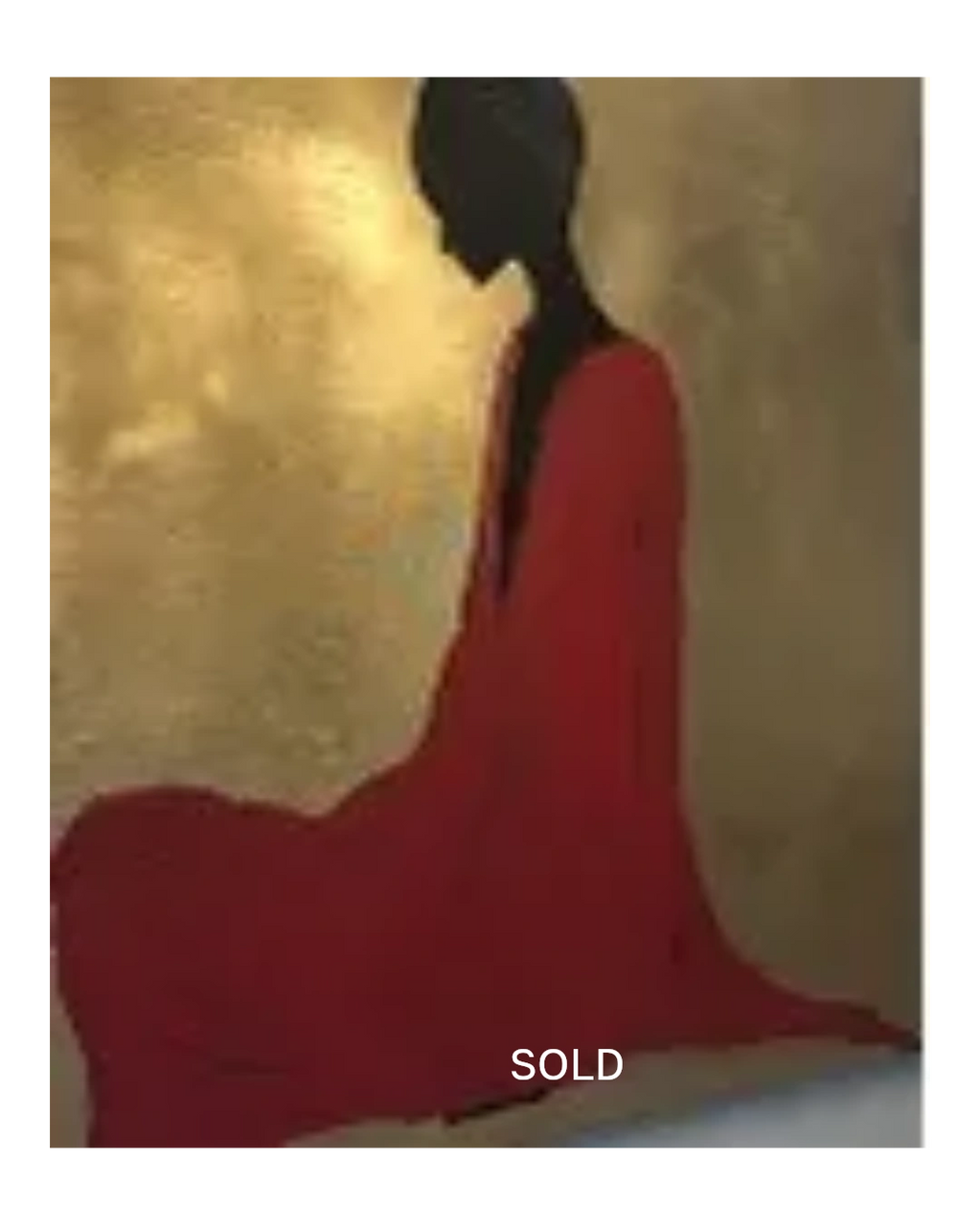 A serene fine art painting that pairs a minimalist silhouette with luminous gold leaf-like tones. The figure, rendered in deep black and draped in a flowing red garment, sits in quiet contemplation